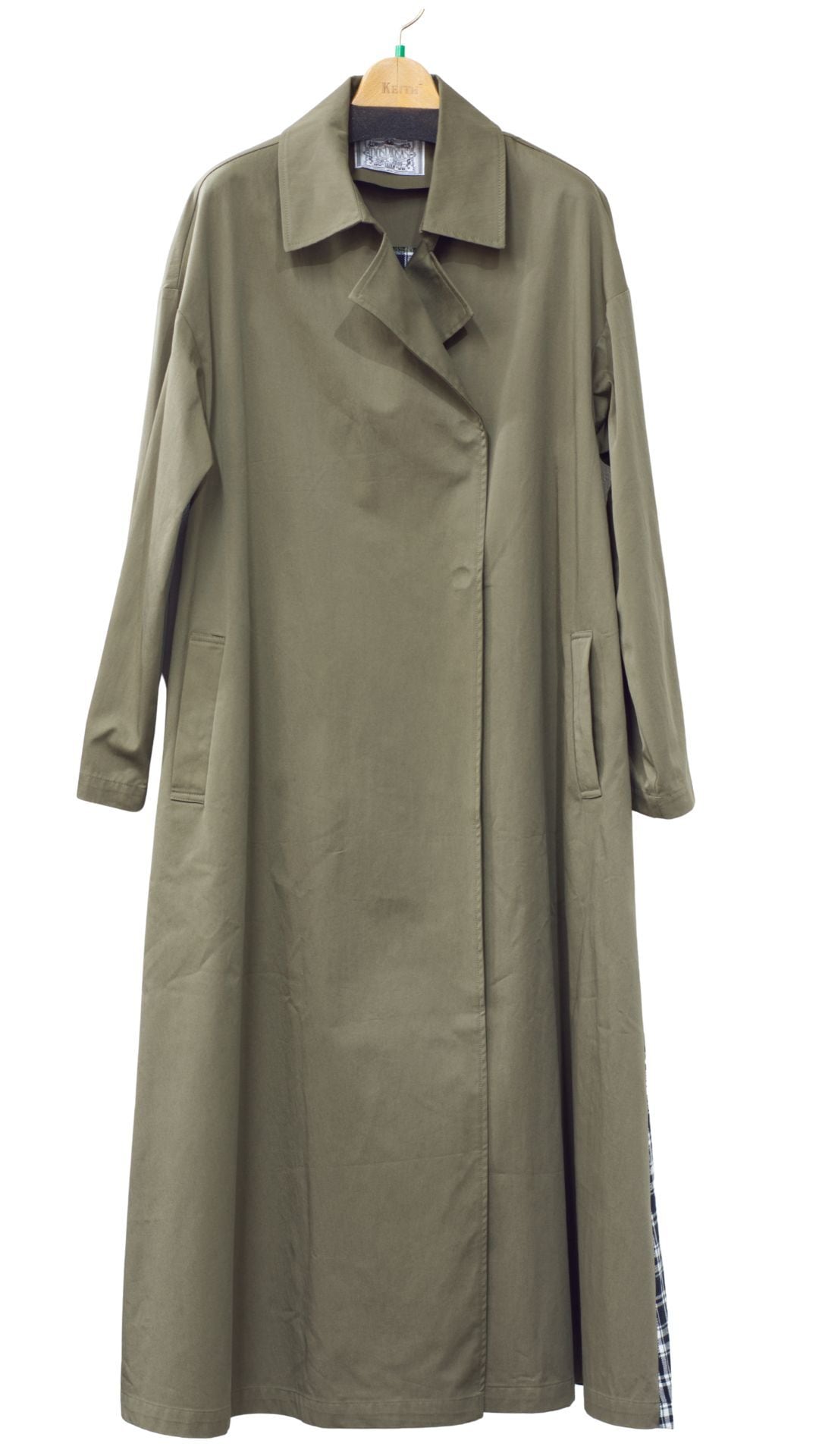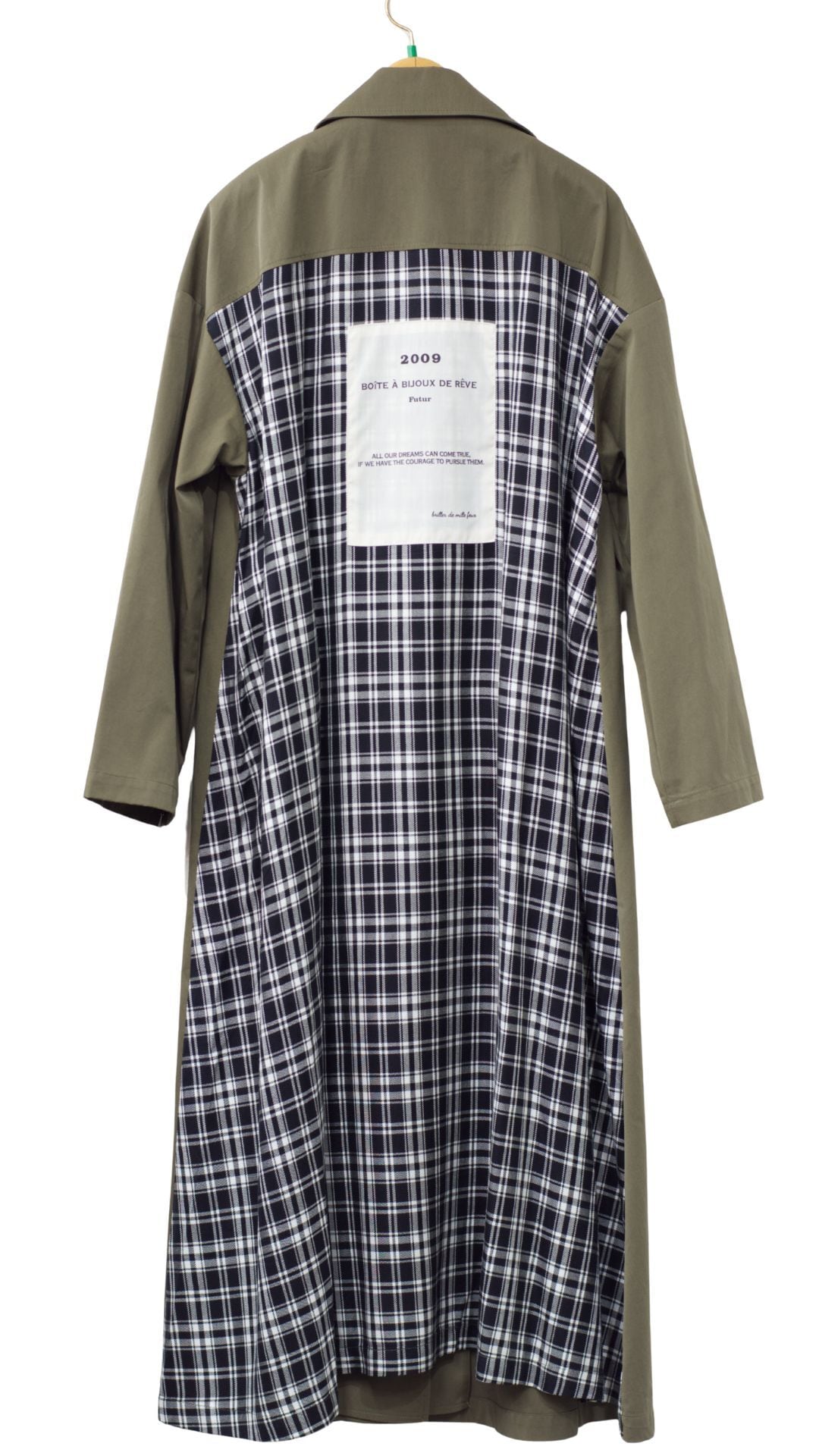 ロングシルエットが縦のラインを強調し、全身をすらりと見せてくれる美しいバランスです。