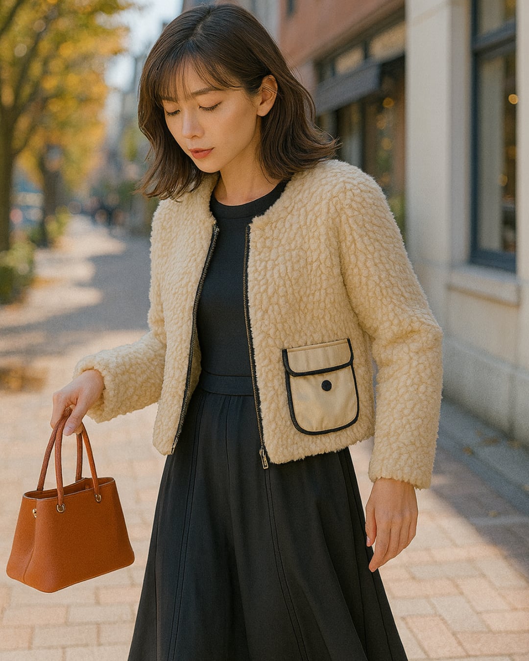 やや丸みのあるシルエットに、配色パイピングと大きめポケットがアクセント。